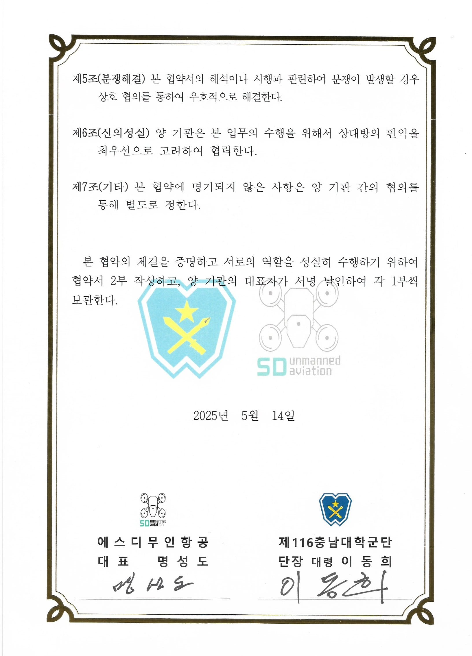 제116충남대학군단(충남대학교 학군단)은 미래 국방 기술의 핵심으로 떠오르는 드론 분야 전문 인재 양성을 위해 에스디무인항공과 업무 협약을 맺었다. 양 기관은 2025년 5월 14일, 충남대학교 내 학군단에서 업무협약(MOU)을 체결하고 국방 드론 운용 능력 향상 및 전문 인력 양성에 상호 협력하기로 뜻을 모았다.